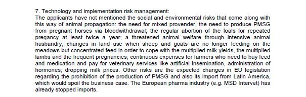 The applicants have not mentioned the social and environmental risks that come along with this way of animal propagation: the need for mixed provender, the need to produce PMSG from pregnant horses via bloodwithdrawal; the regular abortion of the foals for repeated pregancy at least twice a year, a tireatened animal welfare through intensive animal husbandry. Changes in land, when sheep and goats are no longer feeding on the